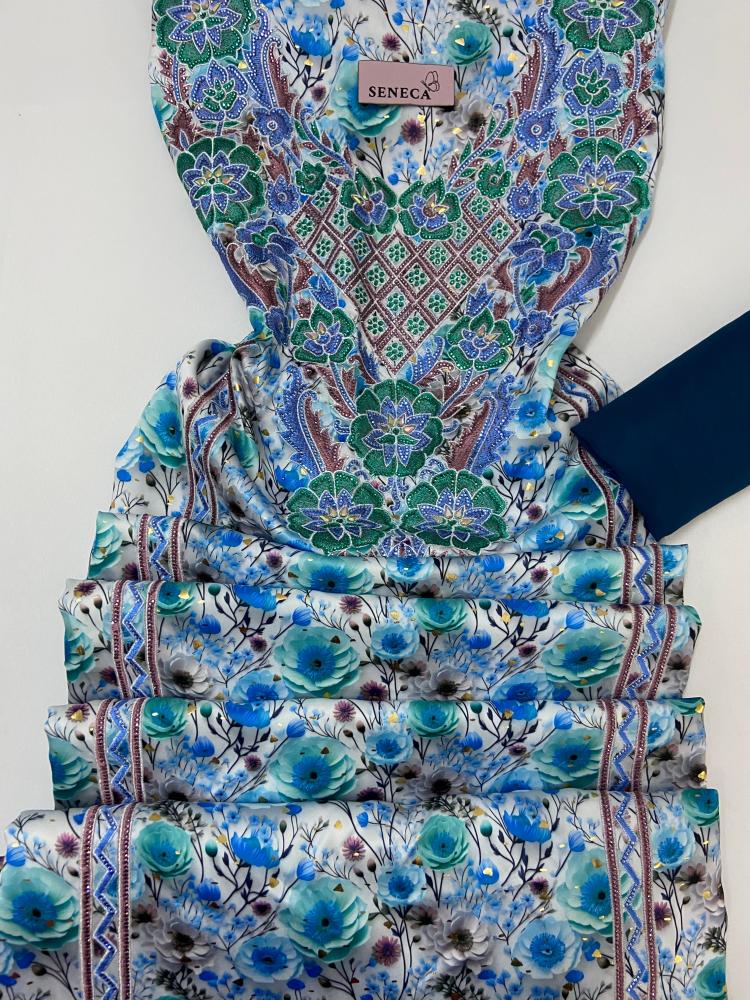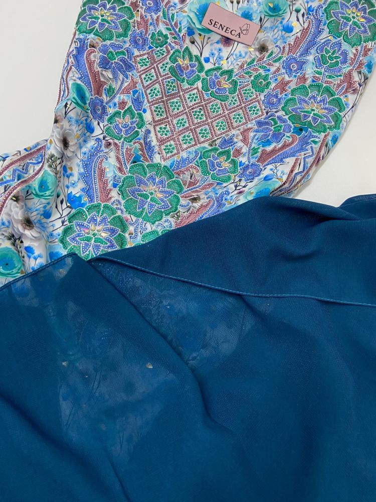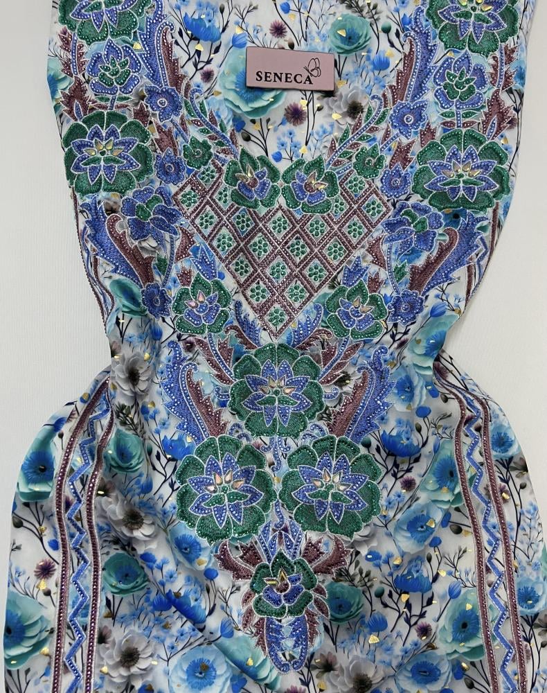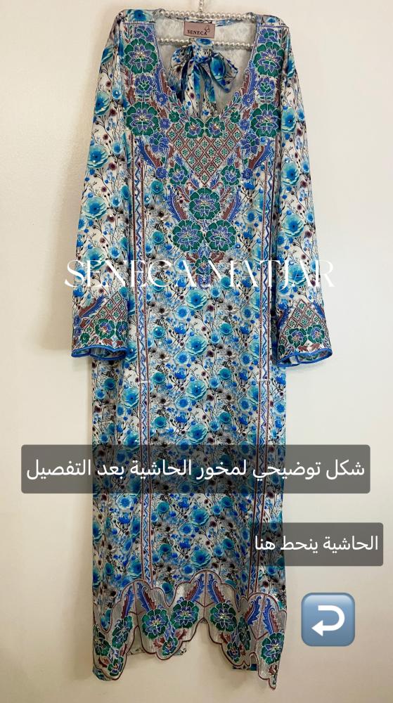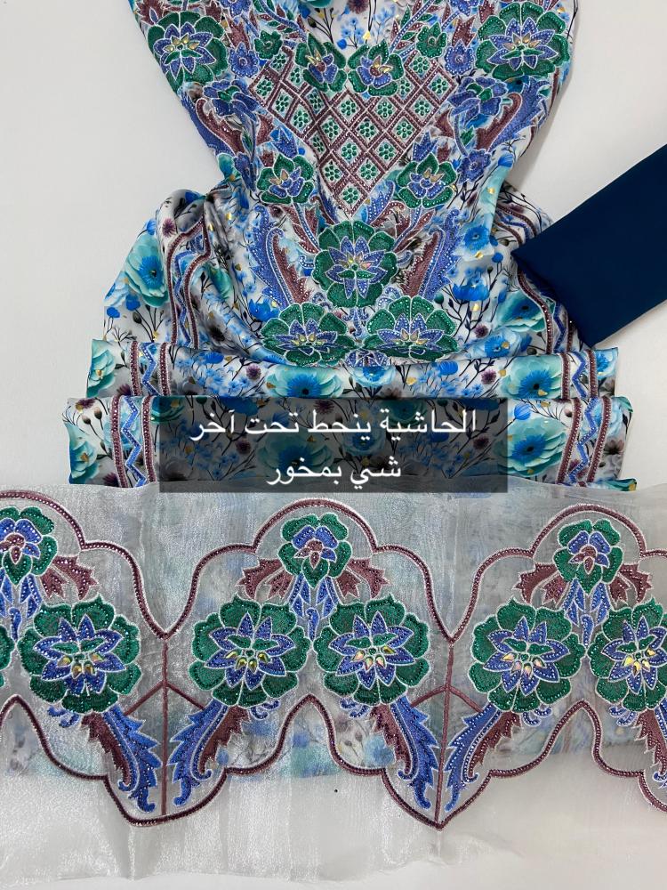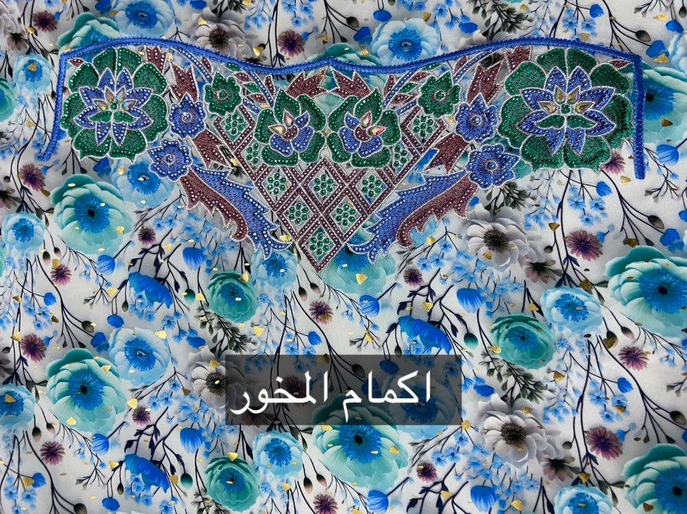 يتميز القماش بنعومته الفاخرة وتفاصيله المتقنة من تطريزات أنيقة وفصوص براقة تضيف إشراقة على منطقة الصدر والأكمام وعلى كامل المخور .