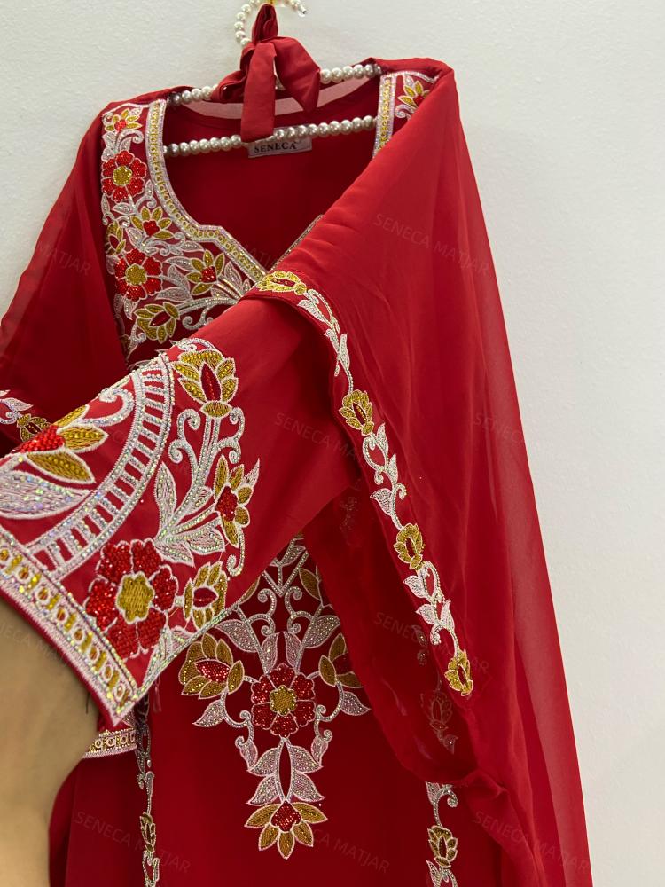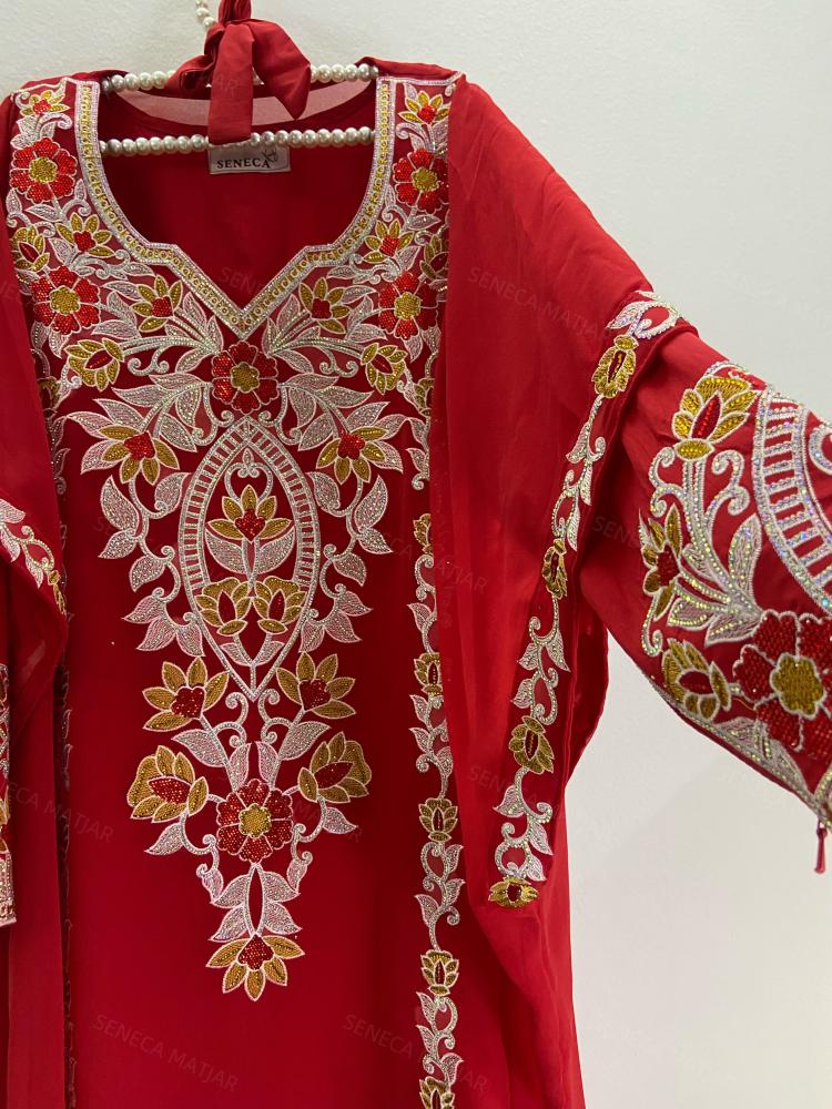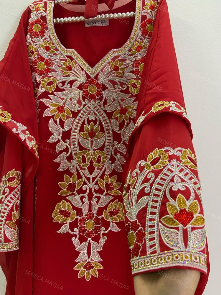 استعدي لتتألقي بثوب خليجي يجمع بين الرقي والفخامة. يتألف من قطعتين: