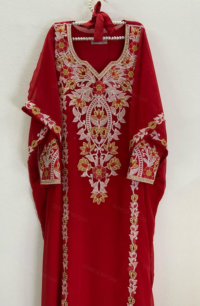 ُصمم الثوب الخليجي بأكمام مزينة بتطريزات عريضة فاخرة.